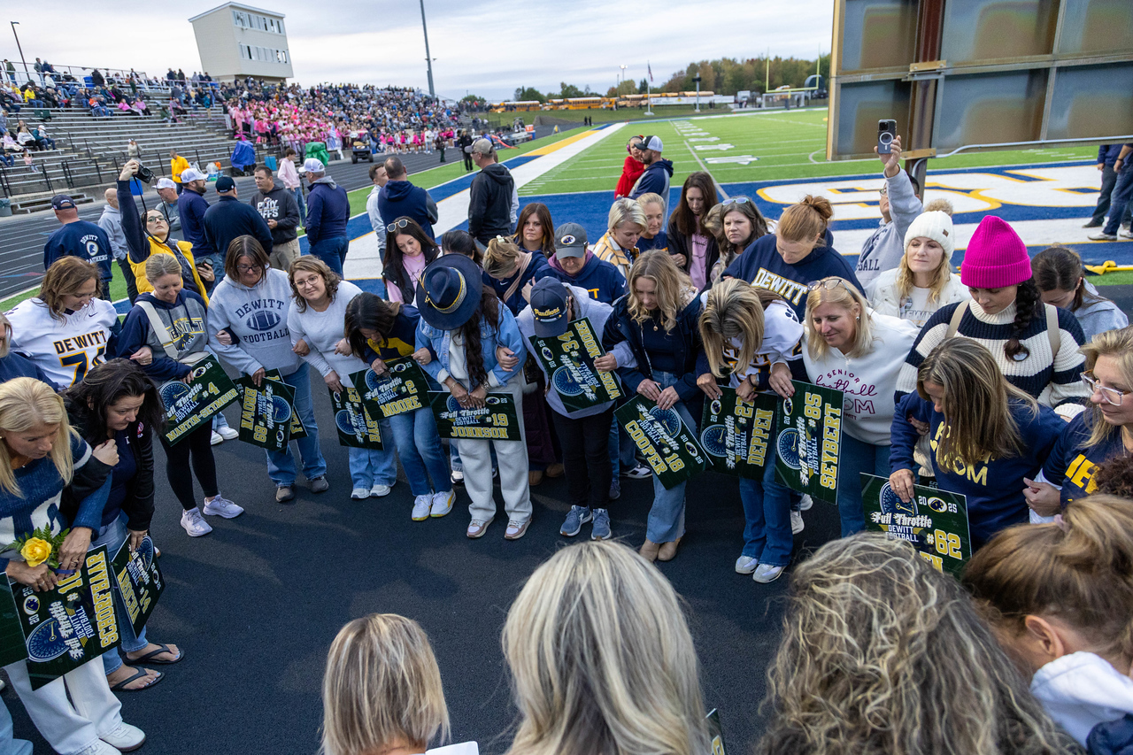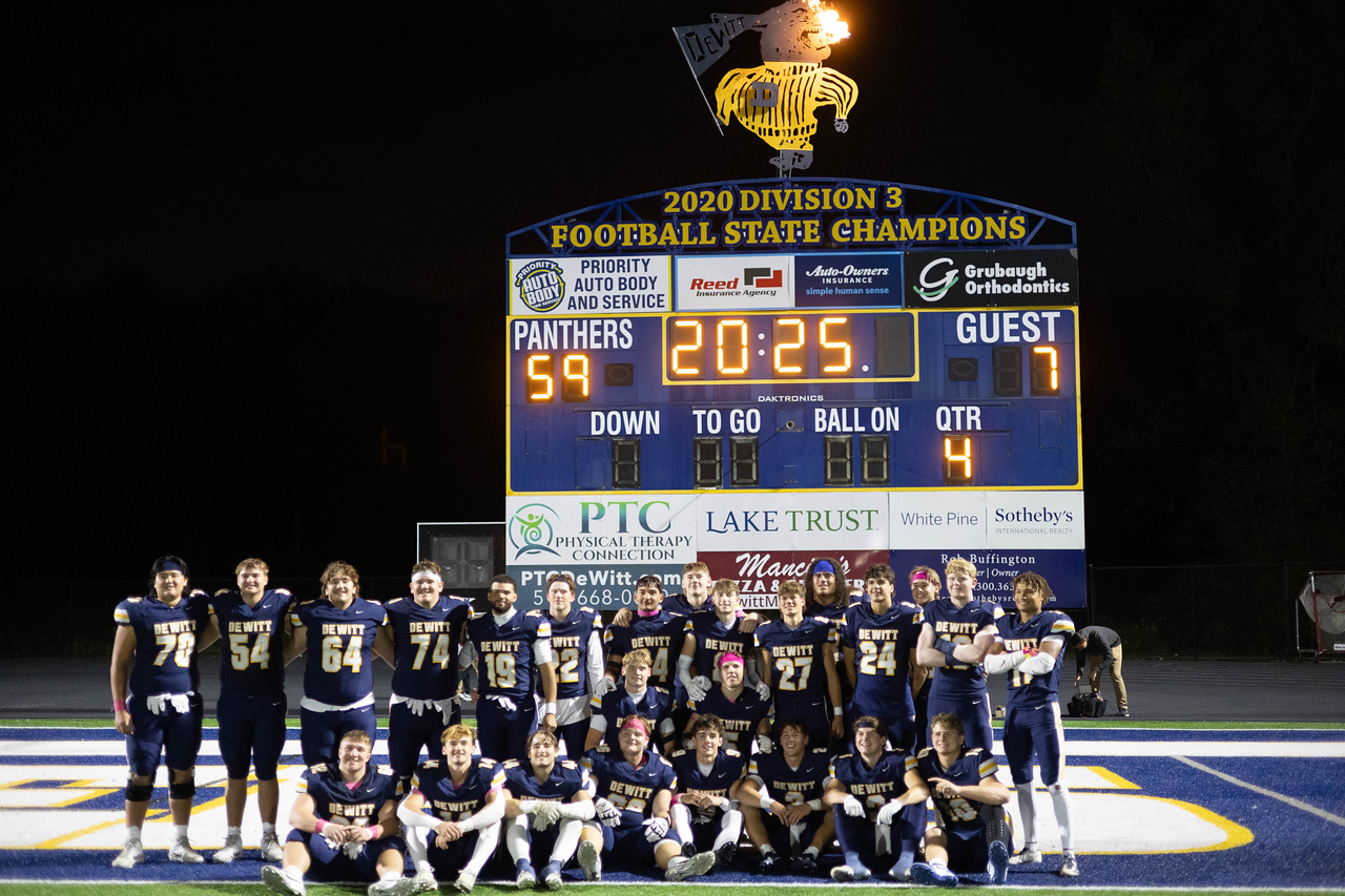 Okemos, MI (10/17/2025): The DeWitt Panthers defeated the Okemos Wolves at Okemos Friday evening, 51-0. With the victory, the Panthers will assured themselves of at least a tie of the CAAC Blue division championship. It was a picture perfect evening for football with the temperatures dipping into the upper 50s. The Panthers scored on all possessions except the end of the half and end of the game. On the Wolves initial drive, they did creep into Panther territory but Lucas Brandell jumped on an Okemos fumble to get the Panther offense onto the field. Playing a conservative offense, the Panther offense drove 60 yards in 7 plays to take the lead with 8:00 minutes to play in the opening quarter on a Channing Ridley 12 yard run off tackle. Trav Moore punched in a two point conversion to make it 8-0 DeWitt. Okemos turned their second possession over on downs and DeWitt had 51 yards to cover and they did in 9 plays. Tyler Bayshore took the last three plays to score on a one yard run. On a fumbled snap, Brandell tossed the ball to Cooper Chambers for the 2 point conversion to make it 16-0, still in the first. Early in the second quarter, a 25 yard run by Moore set up another Bayshore TD, this time 7 yards. Finally Vincent Rose got to kick an extra point and it was good. The next Okemos possession ended up a touchdown... for DeWitt. Forcing a punt by Okemos, Landon Kurncz scooped up the ball at the DeWitt 29 and with several good blocks, expecially by Jadon Bender, he returned the punt 71 yards for the TD. The following drive by Okemos took a shade over four minutes, yet yielded one first down and 5 net yards thanks to a sack by Luke Nolen and DeWitt took over on downs at 2:46 of the second quarter. On a 4th and 10 from the Wolves 30, Ridley not only made up the 10 yards for a first down, he kept going and scored on a 30 yard run to close out the scoring in the first half. DeWitt led 37-0. The third quarter DeWitt took the ball 66 yards in five plays with Ridley closing out his night with a 61 yard end run and when he turned the corner, he was Full Throttle. Okemos had two drives in the 4th with both ending in turnover on downs. Those drives were sandwiched between a 50 yard 10 play drive with Donovan Hillard blasting in from the 2 yard line. Blake Burke led Okemos with 12 of 16 passing for 89 yards. Isaiah Cohoon was 3 of 7 for 53 yards, with a combined 15 of 25 for 142 yards. Xavier Ford had five catches for 71 yards. The rushing game for Okemos only yielded 19 yards. DeWitt ended up with 410 yards of offense on 36 carries. Ridley continues to get better each week and carried the ball 6 times for 145 yards and 3 TDs. Moore ran the ball 10 times for 103 yards, Bayshore ended the night with 45 yards and 8 carries, two of them for TDs. Rose was 5 of 5 on extra points. Cooper Chambers led the Panther defense with 8 tackles, Trevor Preston had six as did Miller Wing. Bender had four tackles and a sack and Nolen and Noah Deneen had a sack as well. Next week, the Panthers will travel to Lansing Everett for a 5:00 kickoff. We will get to see one of the area's best running back in Javari Funches who has 1,700 yards rushing on the season.