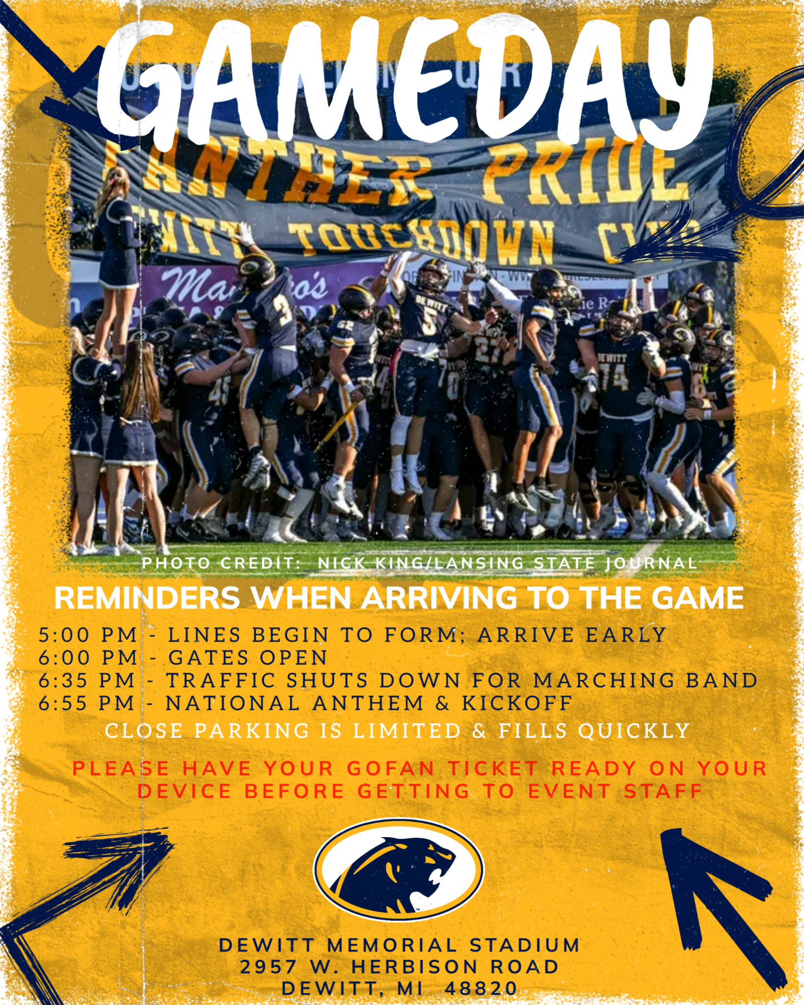 Watching Games: Visit www.NFHSnetwork.com and search DeWitt High School. There is a subscription required. This will allow you to watch games from your easy chair. But, we'd rather have you with us at Memorial Stadium. Listening to games: Games are on the DeWitt Panthers Network by Matt Merrifield live or recorded. Accessing the broadcast can be done by going to www.HighSchoolStreaming.com and click on DeWitt at the top. Sorry for the delay in the update. Had to visit our 4 year old Spider Man out of state for Halloween. 2024 Highlight Video A must see for Panther Fans. Enjoy other DeWitt Panther Football videos. |