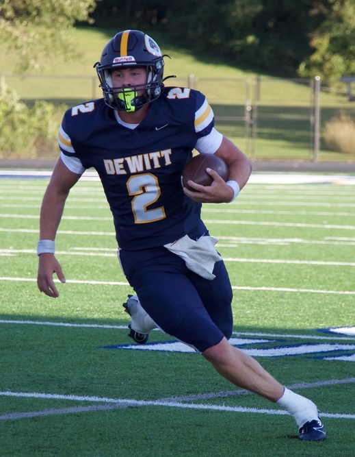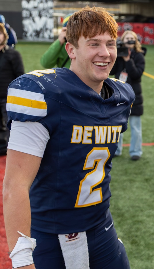 Trav, as a senior, was named to the Associated Press All-State First Team as a running back for the 2025 season. He was also named to the Detroit Free Press Dream Team All-State, Detroit News First Team All-State, Michigan High School Football Coaches Association All-State and Capital Area Activities Conference Blue Division All-League. And for the 2025 season, Moore was named the Offensive Player of the Year in the Lansing State Journal. As a junior he was Honorable Mention Associated Press, Second Team Detroit News All-State, All-Region Michigan High School Football Association and also on the Lansing State Journal Dream Team team and Capital Area Activities Conference Blue Division All-League. His freshman and sophomore seasons he earned Capital Area Activities Conference Blue Division All-League recognition. Deceptively quick and fast and tough, Trav holds many DeWitt season records set in 2025 including most points in a season (208), touchdowns in a season (34), touchdowns rushing game (5 two times), rushing touchdowns in a season (33), yards rushing in a season (2,482), yards rushing in a game (397), carries in a season (235), most games rushing for over 100 yards in a season (12), total yards in season (2,508). DeWitt career records held now are total points (482), touchdowns scored (79), touchdowns rushing (70), yards rushing (4,334), most carries (452), all-purpose yards (5,602 - 4,334 rush, 435 receiving, 299 return). While his senior season he did not play defense but for his career he garnered 75 tackles, 6 batted passes one interception and 12 SMUKS playing cornerback. Moore played running back and defense his first three years on DeWitt Varsity. His junior season he was back up QB for Elliott Larner that engineered the Panthers to a state record of 6,715 total yards (4,471 rushing and 2,244 passing). Trav had 1,102 yards rushing in nine games that season. His senior season, the offense switched to primarily rushing single-wing attack and Moore led the Panthers to second place on all time State record books with 6,697 total yards, just 18 yards short of the 2024 team. They broke the state record for rushing yards in a season with 5,637. The 2025 team scored 102 touchdowns, just one shy of the state record. The 2024 team scored 101 touchdowns. The two seasons combined are the two most prolific offensive back-to-back seasons in state history with 203 touchdowns and 13,412 total yards. Moore also engineered the 2025 Panthers to a Division 3 state title and a 14-0 record. In the championship game, he set or tied the finals game records for most touchdowns in a half (4), quarter (3), rushing yards (397), team rushing (575), rushing touchdowns (7) and total team offense (639). He garnered 1,279 rushing yards during the five game push through the playoffs. His senior season he also was 77 of 99 for 934 yards and 13 touchdowns. |