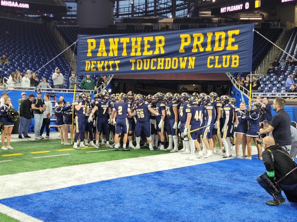 Ford Field, Detroit, MI(11/30/2025): The DeWit Panthers completed an undefeated season by defeating the Mt. Pleasant Oilers 54 to 20 at Ford Field in Detroit in record breaking fashion. It is the second state title for DeWitt in six years. DeWitt raced out to a 40-14 lead at the half then tacked on two more scores in the final quarter. In the process of still accumulating stats but, what we know at this moment: Championship Game Records: Season State Records: Game statistics.